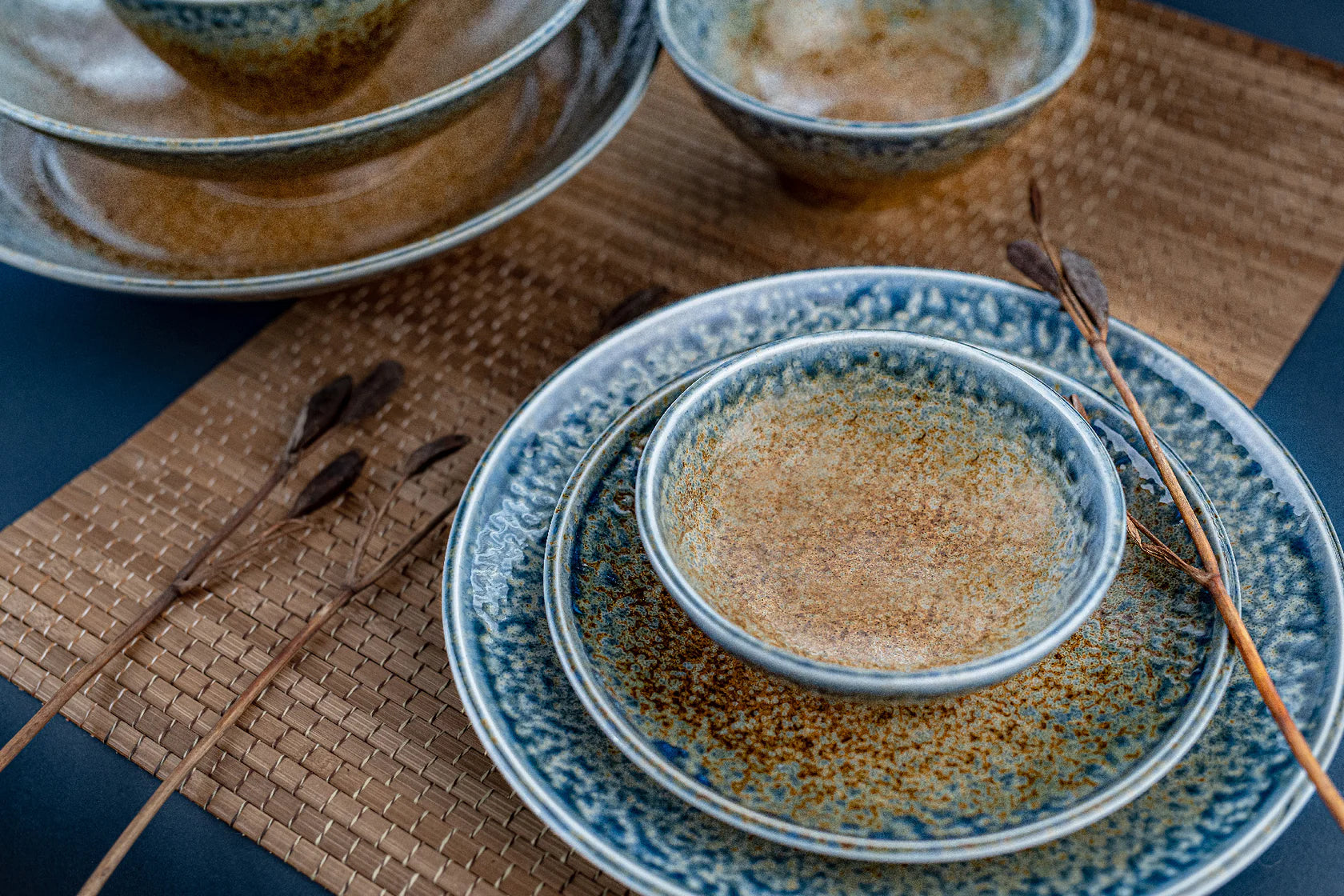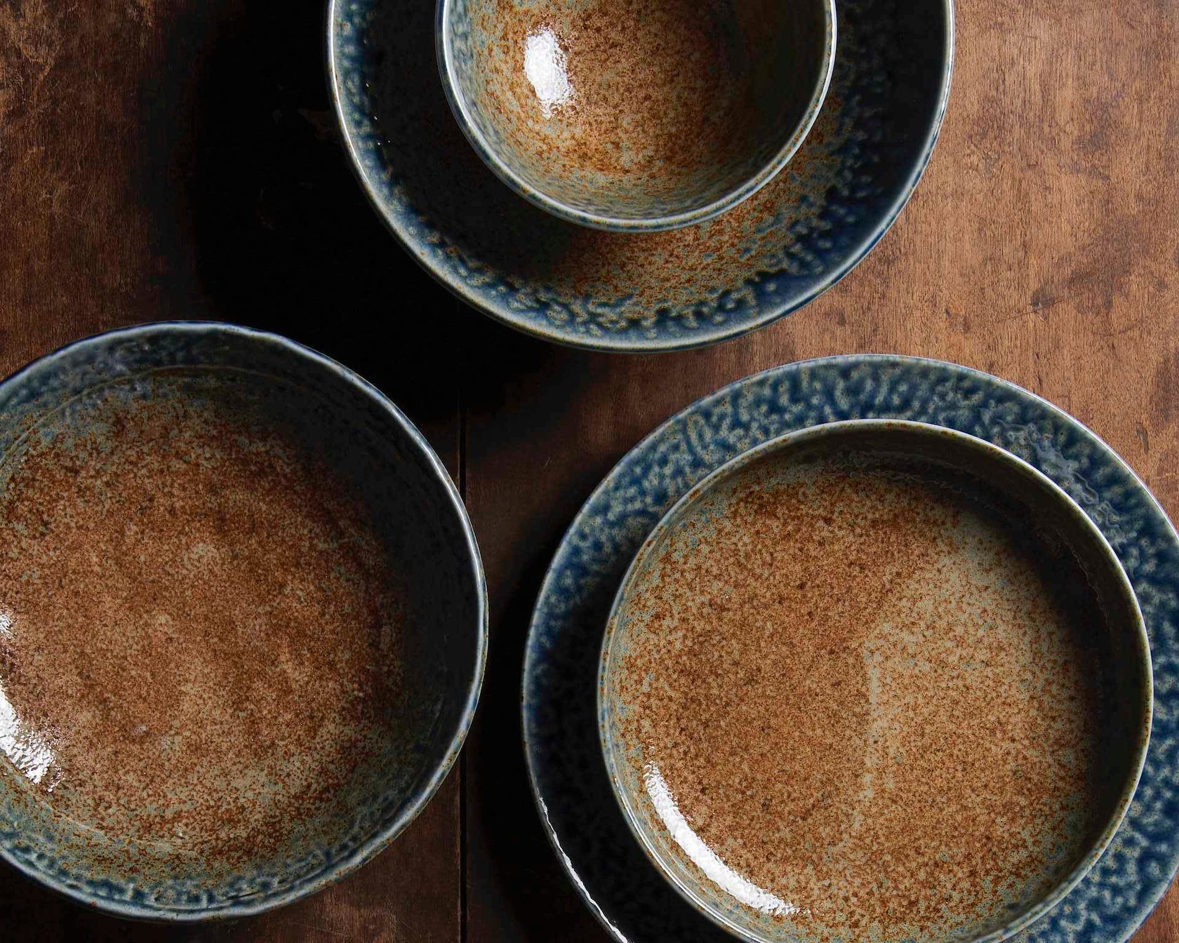 The Earth & Sky range features a hand-dipped edge of bold ink-blue contrasted with a speckled tawny brown