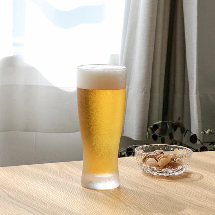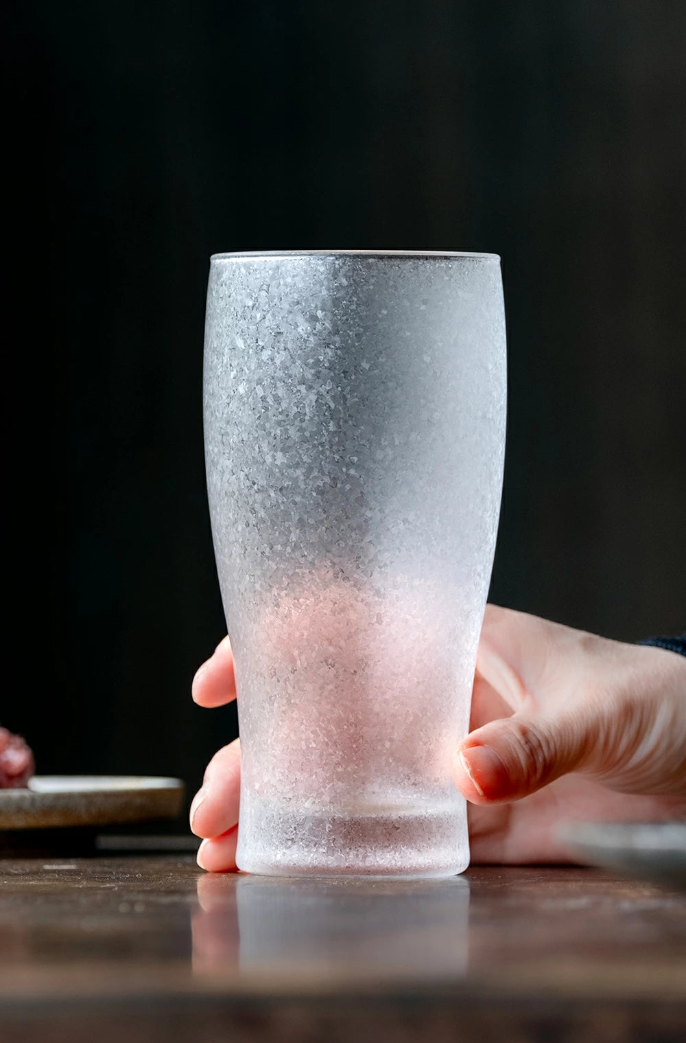 The Aderia Mizore glassware series features a unique surface finish that gives each piece a soft, shimmering texture reminiscent of delicate frost.