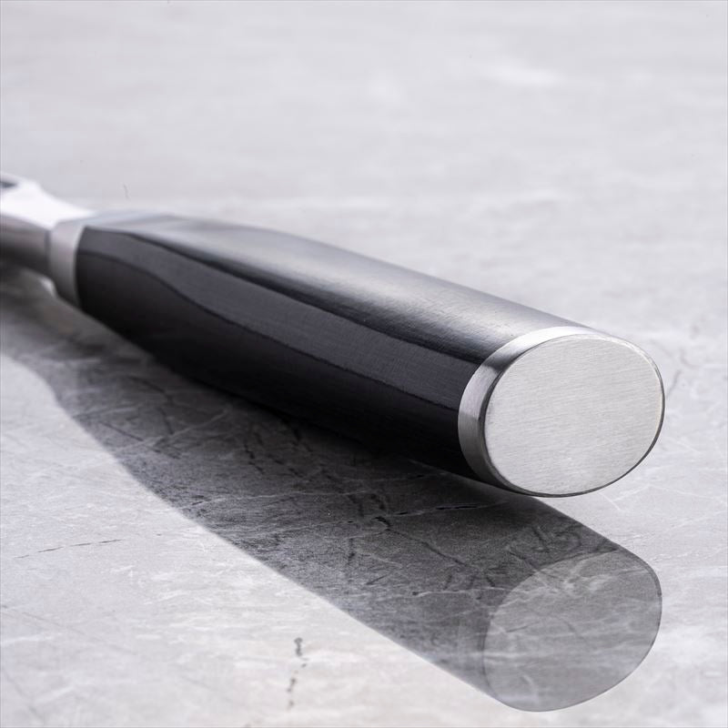 The slim handle is made from durable pakkawood, shaped in the traditional Japanese chestnut form. Reinforced with high-quality resins, it is highly resistant to moisture and everyday wear. A subtle ridge along the right side of the handle provides a secure, comfortable grip during use, while the integrated tang enhances overall stability and balance.