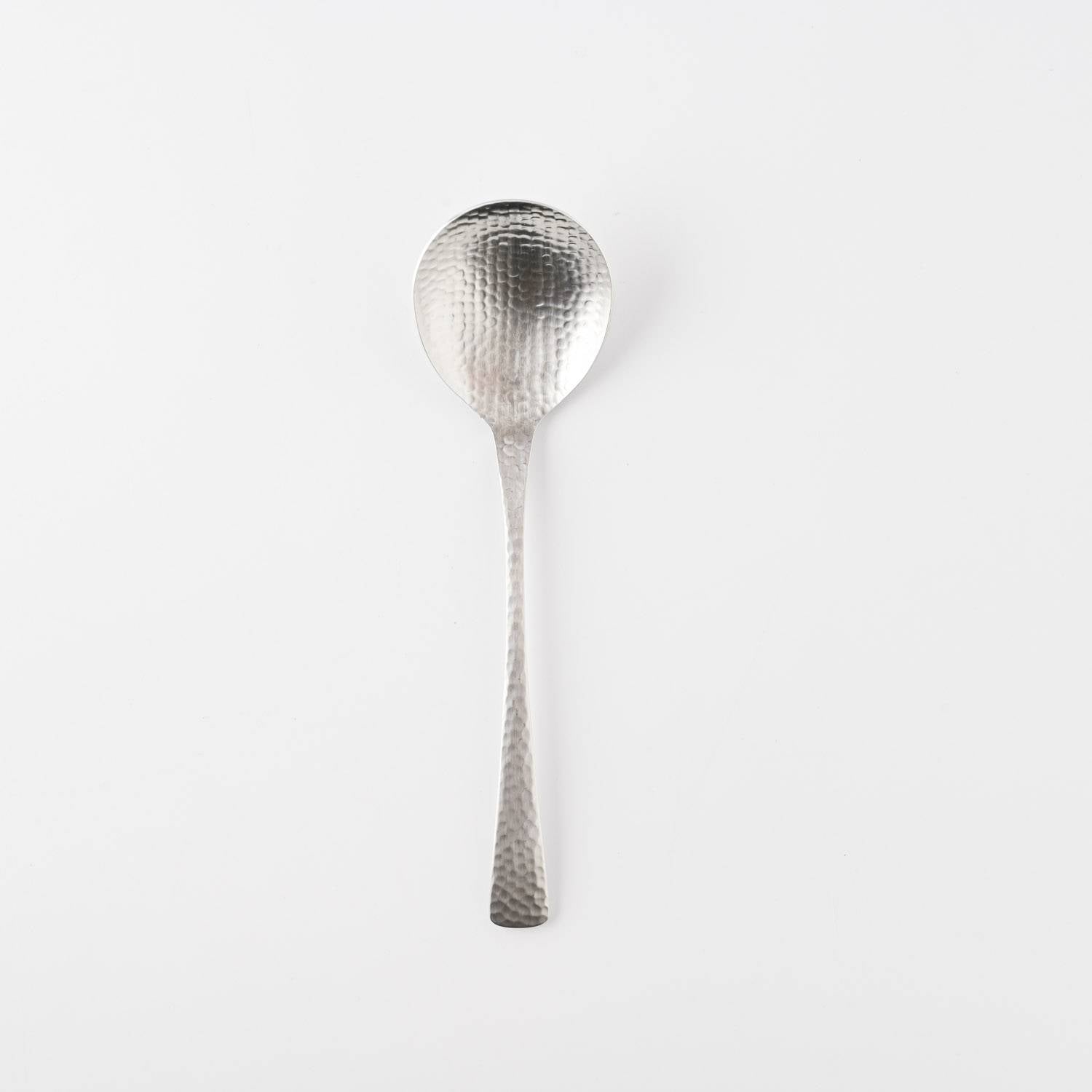 This elegant soup spoon is thoughtfully shaped for enjoying soups, broths, and bouillon, with a gently rounded bowl that feels comfortable and natural at the lips. Its well-balanced weight offers a reassuring feel in the hand, while the hammered surface adds subtle texture and a refined, luxurious presence to the table.