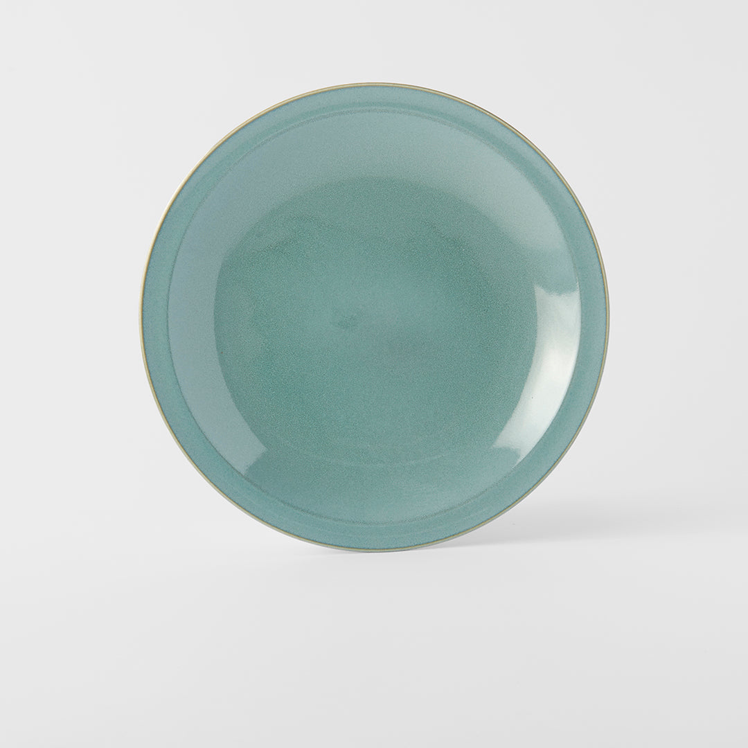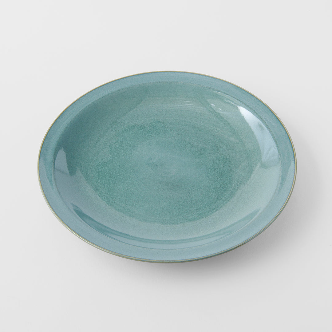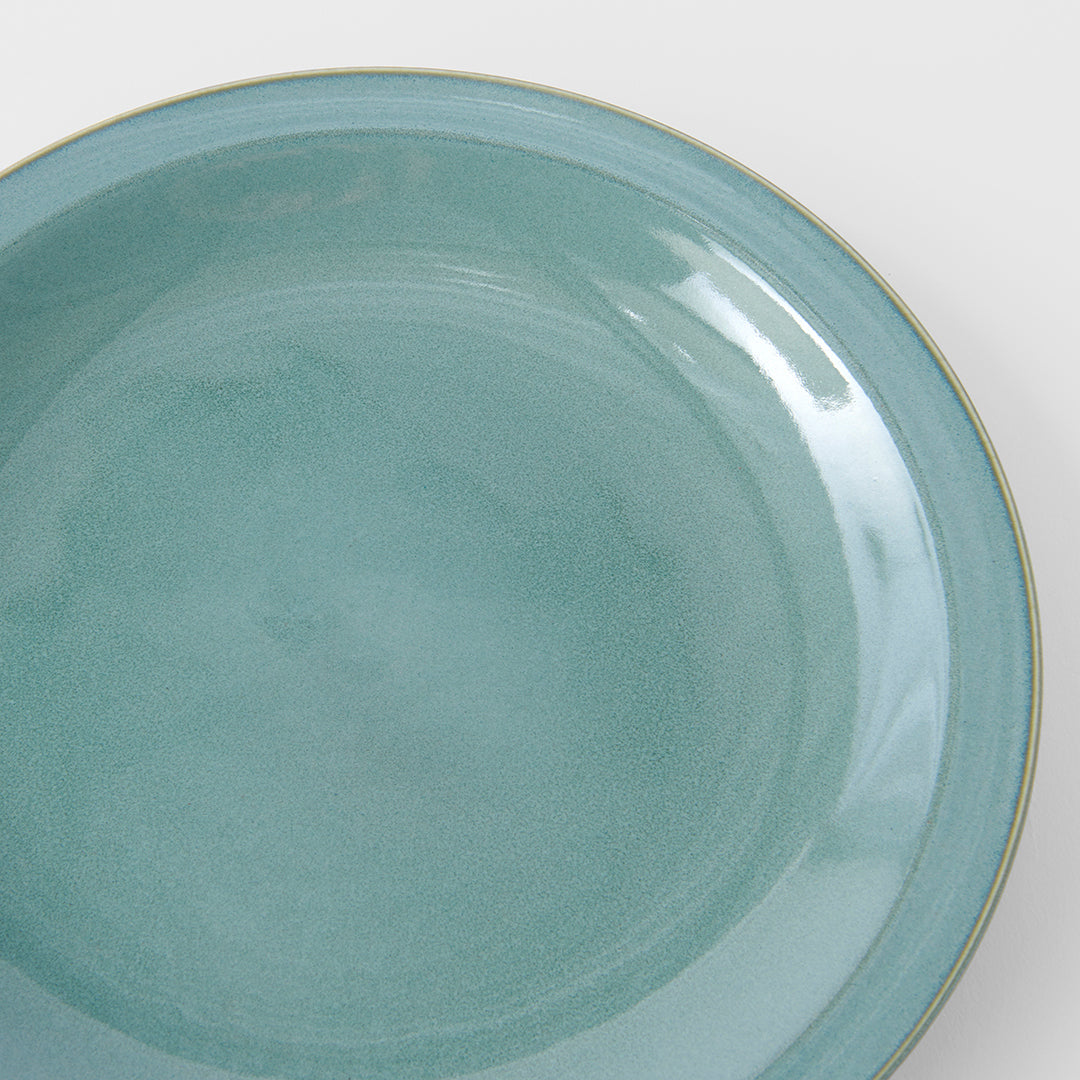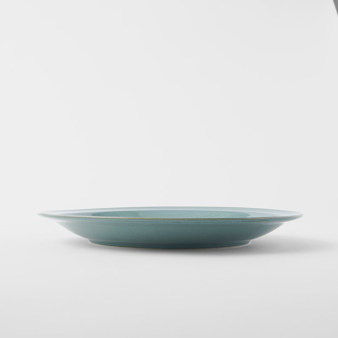 A Japanese hand finished large dinner plate featuring a modern shape with a raised edge in a sea green glaze.