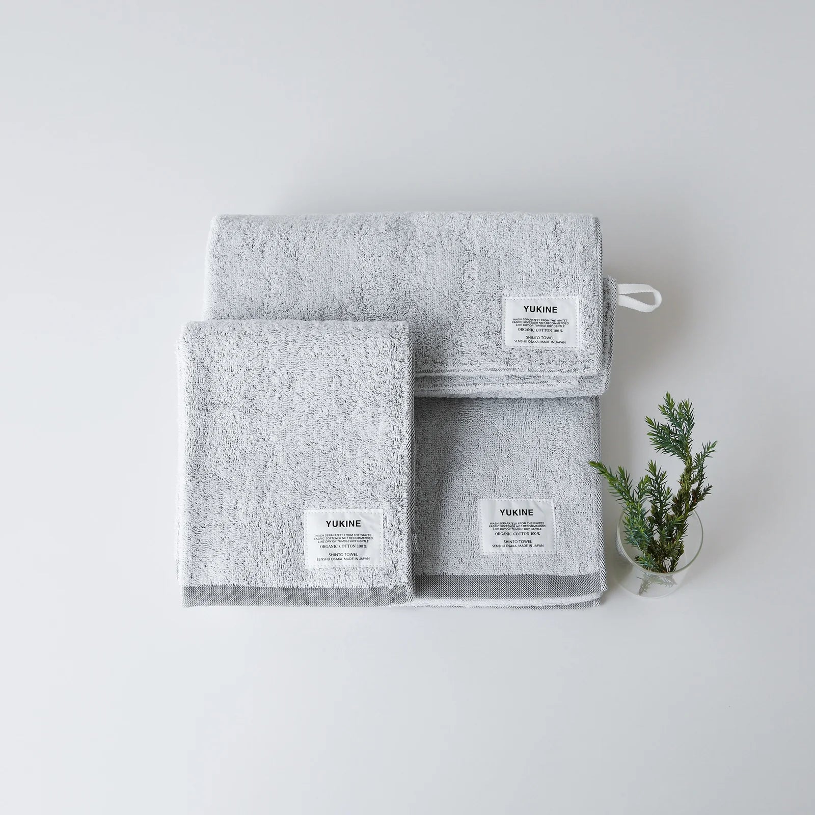 The squeaky clean feeling of the YUKINE towel comes from a refined method called Atozarashi. This regional process removes starch and natural impurities from the cotton after weaving, enhancing its absorbency. YUKINE undergoes this process twice to maximize the cotton's ability to absorb water. The refined cotton fibers produce a squeaky feel and soften with each wash. The design combines white cotton yarns for the warp and colored yarns for the weft, creating patterns inspired by nature, such as earth, water, and snowy landscapes.