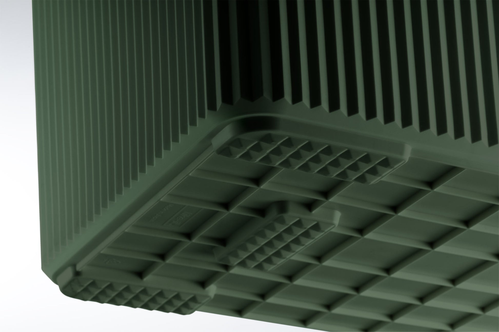 The rounded handles provide a comfortable grip and can support up to 100 kg, while the lid locks securely with a simple push. Its spike-joint base allows stable stacking both vertically and horizontally, up to three tiers high.
