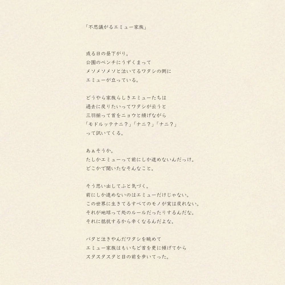 This "Towel Tenugui" is a towel that reflects the mysterious world of MiW's pictures and stories. It combines the ease of use of a tenugui with the texture of a towel. Thin threads are used on both sides and woven into a short pile, so the front side feels slightly smooth to the touch. The back side is made of two loosely twisted single threads that are gently twisted to create a soft, elastic texture like a sponge.